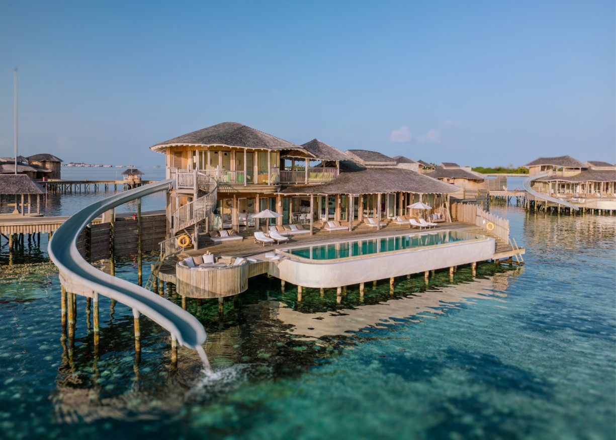 These 24 water villas are the largest in the Maldives. All the villas here have a large private pool facing the lagoon. Some of the villas also have water slides to slide down directly into the lagoon.